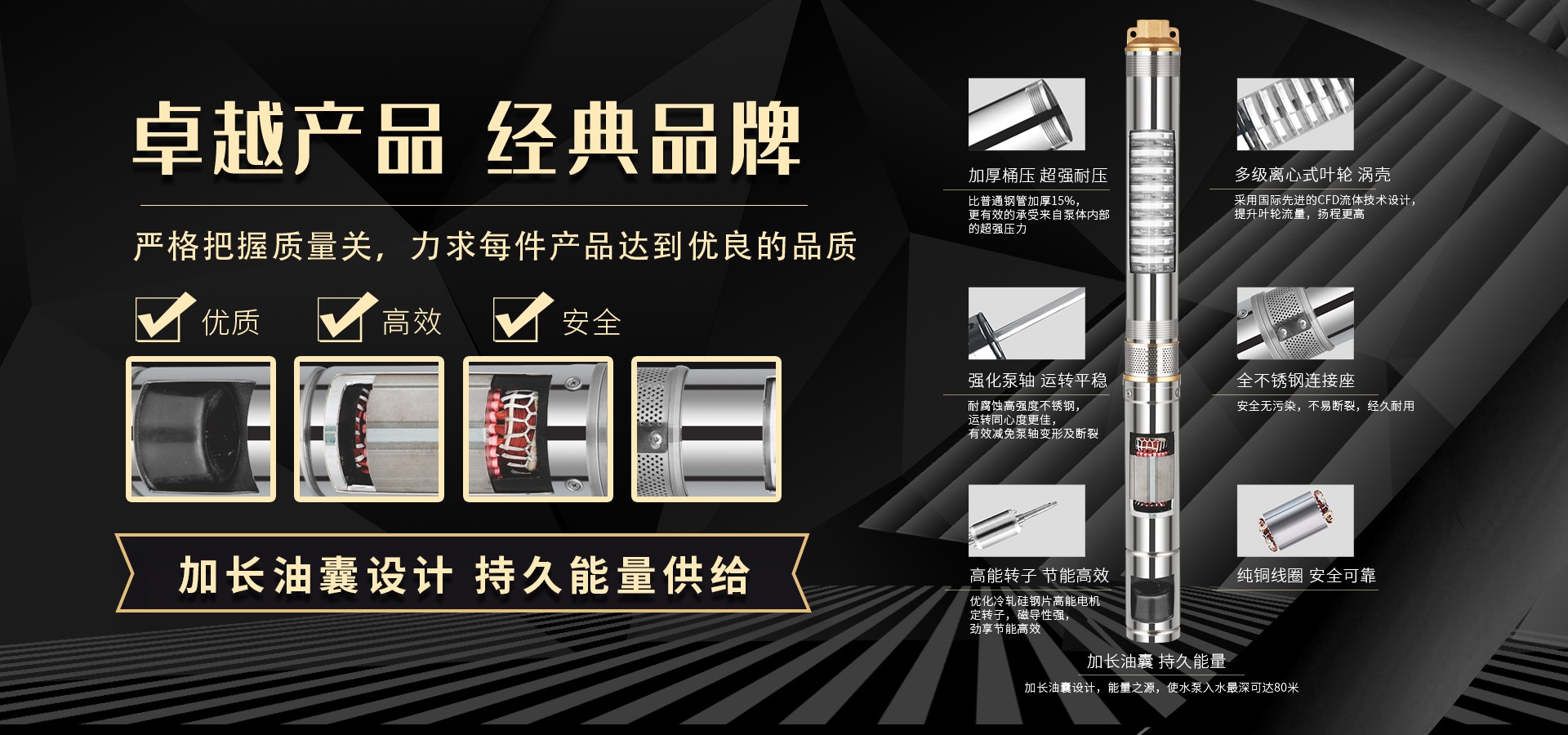 不僅僅是泵,更是流動的科技。十多年來,本公司堅持走:以質量求生存以科技創(chuàng)新求發(fā)展,重合同守信用的道路,生產(chǎn)經(jīng)營得到迅速發(fā)展。更希望以后不管從發(fā)達城市到新農(nóng)村,從工業(yè)制造到尖端科技產(chǎn)業(yè)都隨處可見創(chuàng)江井泵的身影,創(chuàng)江深井泵已成為干萬用戶心目中優(yōu)質和信心的保證我們將以優(yōu)質的產(chǎn)品和最完善的售后服務來真誠與各界朋友開展廣泛的合作,共同創(chuàng)造一個美好的未來!